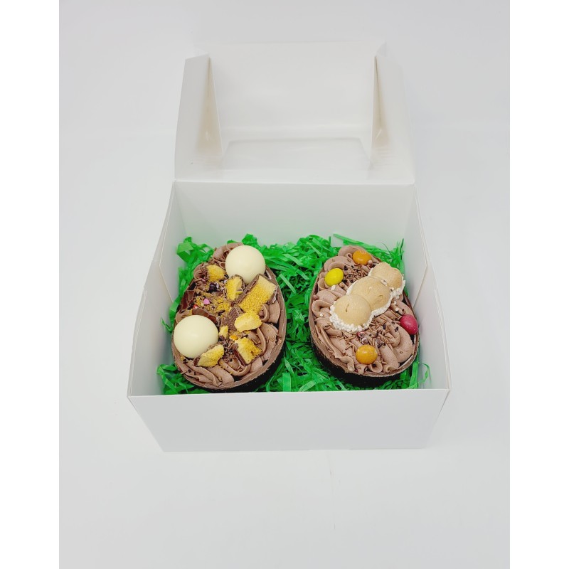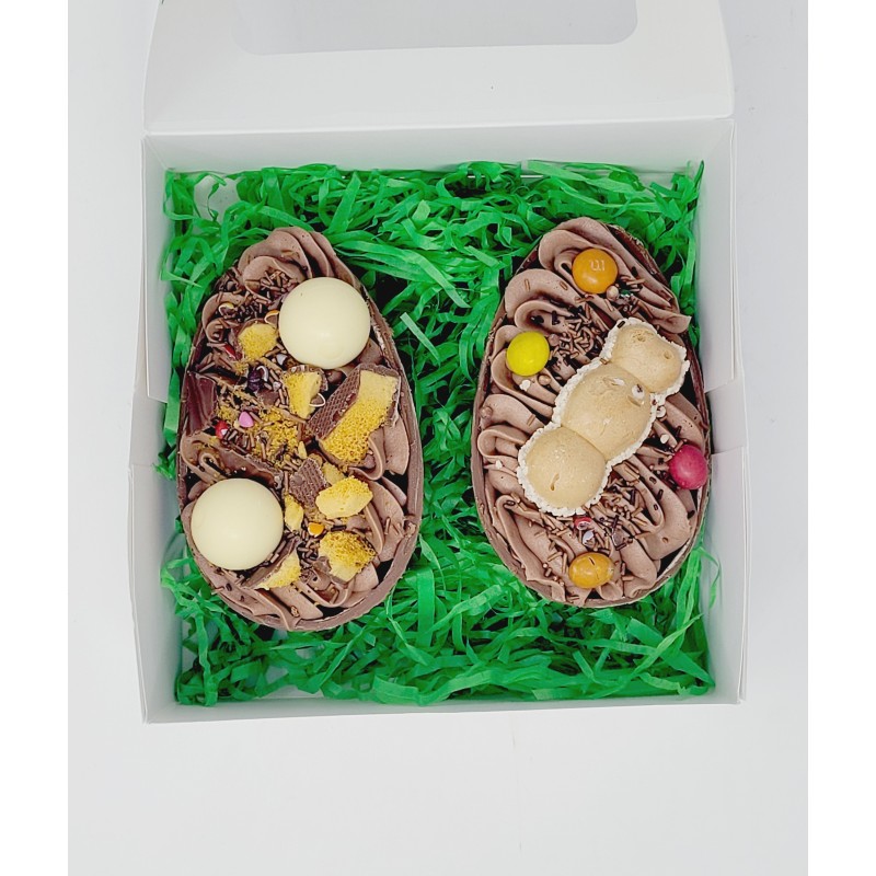 What a treat! 2 half a Cadburys egg filled with chocolate or vanilla cake topped with buttercream and Easter chocolates.
