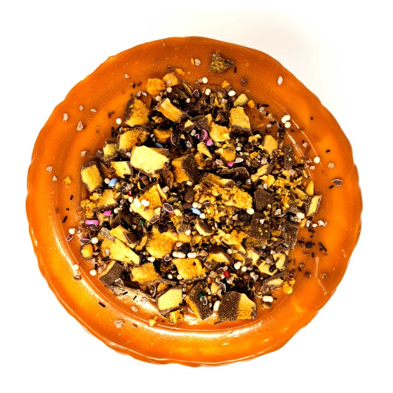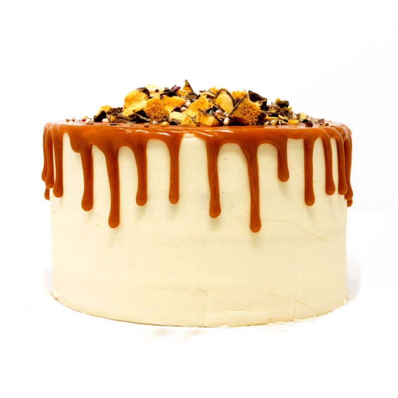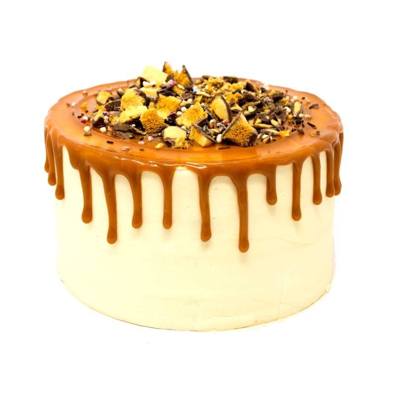 Vanilla sponge filled with caramel buttercream, dripped with smooth caramel and topped with honey comb.