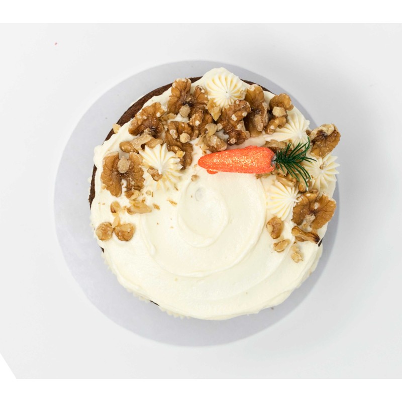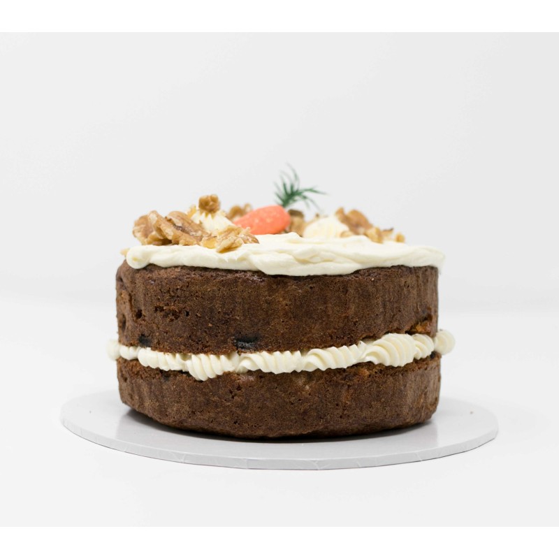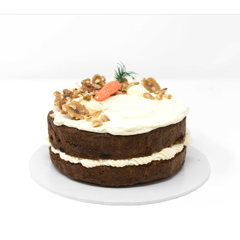 Beautifully crunchy moist carrot cake, made with carrots, raisins, walnuts and cream cheese frosting between 2 layers and ontop then Sprinkled with walnuts.