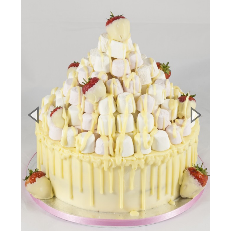 Marshmellow tower cake, vanilla sponge cake filled with melted marshmallow frosting and jam. Topped with towering marshmallows and drizzled in white chocolate.
