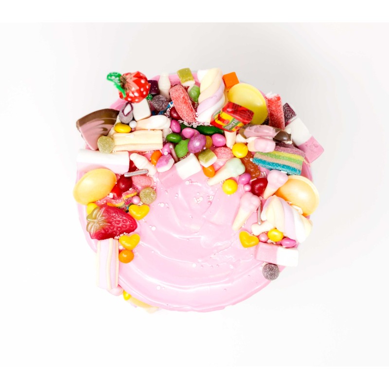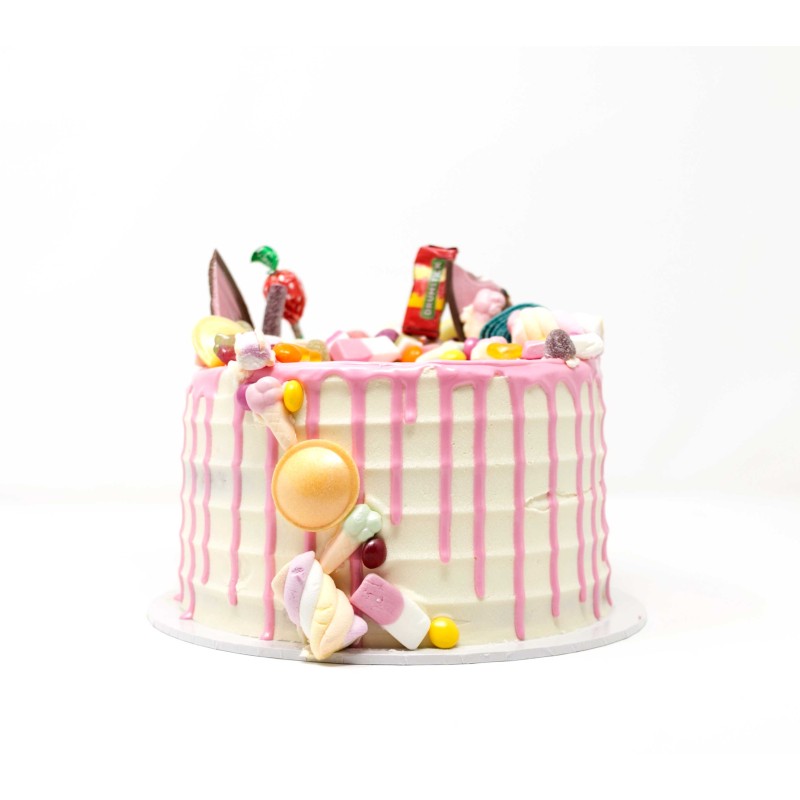 Vanilla sponge filled with strawberry jam and buttercream, dripping in white chocolate and smothered in sweets! Perfect party cake!